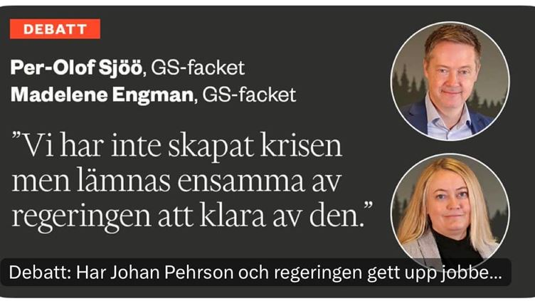 GS-fackets förbundsordförande Per-Olof Sjöö och avtalssekreterare Madelene Engman skriver en debattartikel i tidningen Arbetet. Anledningen är regeringens likgiltighet inför byggkrisen och dess effekter på arbetslösheten bland träindustriarbetarna.