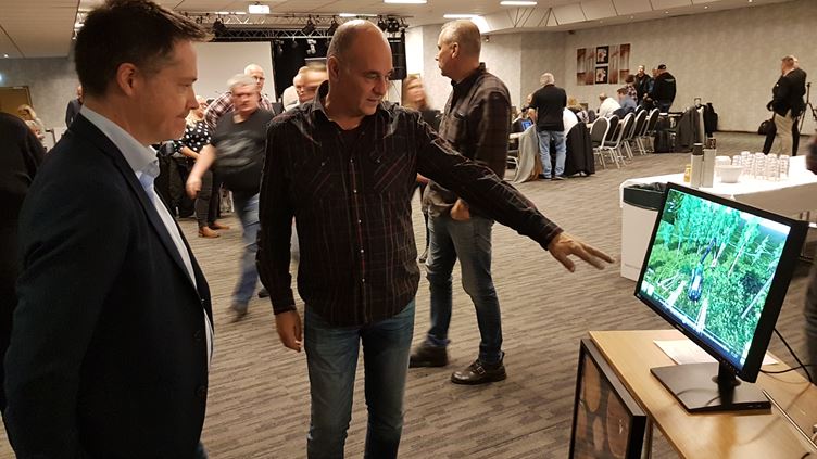 GS medlemmen och projektdeltagaren Mats Westerberg demonstrerar för Per-Olof Sjöö hur det kan se ut inifrån simulatorn